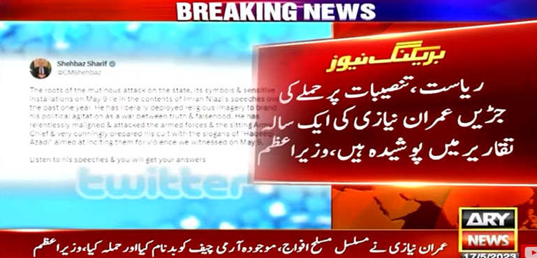 شہباز شریف نے اپنے ٹویٹ میں کہا ہے کہ ریاست اور تنصیبات پر حملے کی جڑیں عمران نیازی کی ایک سالہ تقاریر میں پوشیدہ ہیں۔ انہوں نے سیاست کو مذہبی رنگ دے کر حق اور باطل کی جنگ قرار دیا، مسلسل مسلح افواج، موجودہ آرمی چیف کو بدنام کیا اور حملہ کیا۔