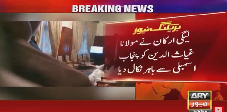 لیگی ارکان نےمولاناغیاث الدین کوپنجاب اسمبلی سےباہر نکال دیا،لیگی چیف وہپ خلیل طاہرنےغیاث الدین کوایوان میں بیٹھنےسےمنع کیا جس کے بعد مولاناغیاث الدین ایوان سےباہر چلےگئے۔