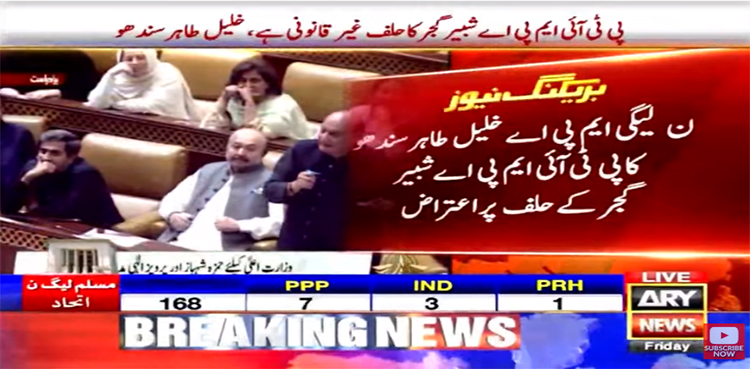 ن لیگی ایم پی اے خلیل طاہر سندھو نے پی ٹی آئی ایم پی اے شبیرگجر کےحلف پر اعتراض اٹھا دیا۔