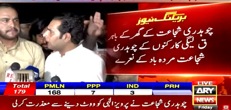 اس موقع پر کارکنوں نے شدید احتجاج کرتے ہوئے چوہدری شجاعت مردہ باد کے نعرے بھی لگائے اور کہا کہ 2 دہائیوں سے چوہدریوں کو سپورٹ کررہے ہیں۔ اس عمل سے چوہدری شجاعت کا نام تاریخ میں اچھے الفاظ میں نہیں لکھا جائیگا۔ ووٹ ہم دیتے ہیں اور یہ مشورے کسی اور کے مان لیتے ہیں۔ ضمنی انتخاب کا نتیجہ سب کے سامنے ہے کہ عوام کس کیساتھ ہیں لیکن وقتی اقتدار کے لیے اپنا ضمیر بیچ دیا گیا۔