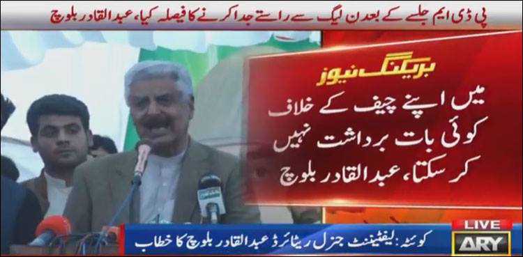 اے آر وائی نیوز کے مطابق کوئٹہ میں میڈیا سے گفتگو کرتے ہوئے لیفٹیننٹ جنرل (ر) عبدالقادر خان کا کہنا تھا کہ پی ڈی ایم جلسےکے بعدمسلم لیگ ن سے راستےجدا کرنے کا فیصلہ کیا۔