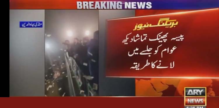 تاہم منڈی بہاؤالدین میں جلسے سے ایک رات پہلے اسٹیج سے نوٹ نچھاور کیے گئے۔