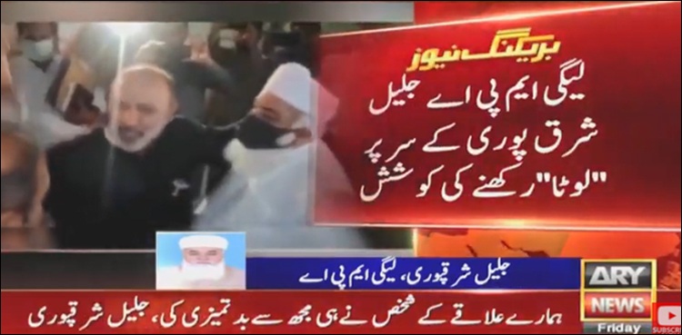 لاہور: مسلم لیگ کے رہنماؤں نے منحرف رکن اسمبلی جلیل شرقپوری کے ساتھ افسوسناک رویہ اختیار کیا اور اُن کے سرپر ’لوٹا‘ رکھ دیا۔
