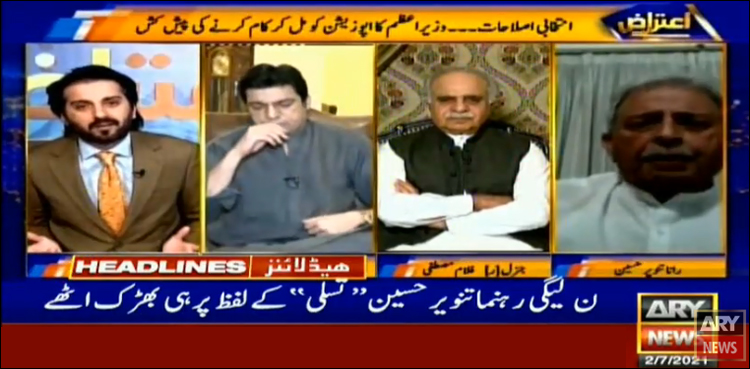 اسلام آباد: مسلم لیگ ن کے رہنما رانا تنویر سوال کرنے پر پروگرام ’اعتراض ہے‘ کے میزبان عادل عباسی سے الجھ پڑے۔