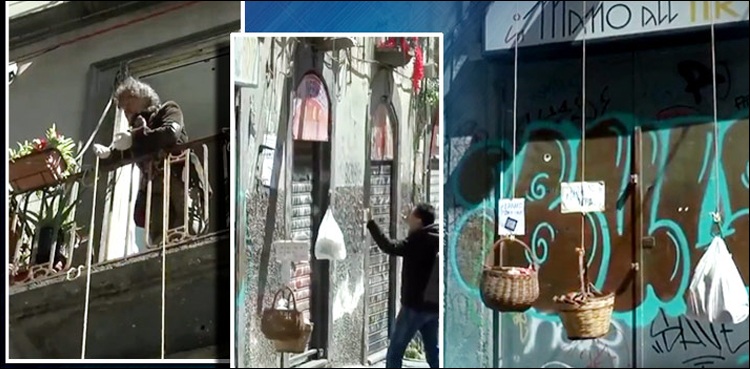 اٹلی کے شہریوں نے بے گھر افراد کی مدد کرنے کا انوکھا طریقہ نکالا اور اپنے گھروں کی بالکونیوں سے ٹوکریاں باہر لٹکا دیں جن میں پھل، کھانا اور دیگر ضروری اشیاء موجود ہیں۔