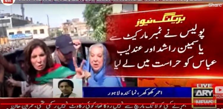 تفصیلات کے مطابق حقیقی آزادی مارچ کے موقع پر پولیس کی جانب سے تحریک انصاف کی رہنماؤں کی گرفتاریوں کا سلسلہ جاری ہے ، پولیس نے ٹمبر مارکیٹ سے یاسمین راشد اور عندلیب عباس کو حراست میں لے لیا۔