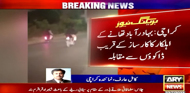 اے آر وائی نیوز کے مطابق بہادرآباد تھانے کے اہلکار کا کارساز کے قریب ڈاکوؤں سے چلتی موٹرسائیکل پر مقابلہ ہوا، پولیس اہلکار نے دلیری کا مظاہرہ کرتے ہوئے ڈاکوؤں کو گرفتار کرلیا۔