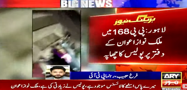 اے آر وائی نیوز کےمطابق پولیس نے پنجاب کے ضمنی الیکشن میں لاہور کے حلقہ پی پی 168 سے پی ٹی آئی امیدوار ملک نواز اعوان کے دفتر پر چھاپہ مارا اور نواز اعوان کے گارڈ سمیت 4 کارکنوں کو حراست میں لے لیا۔