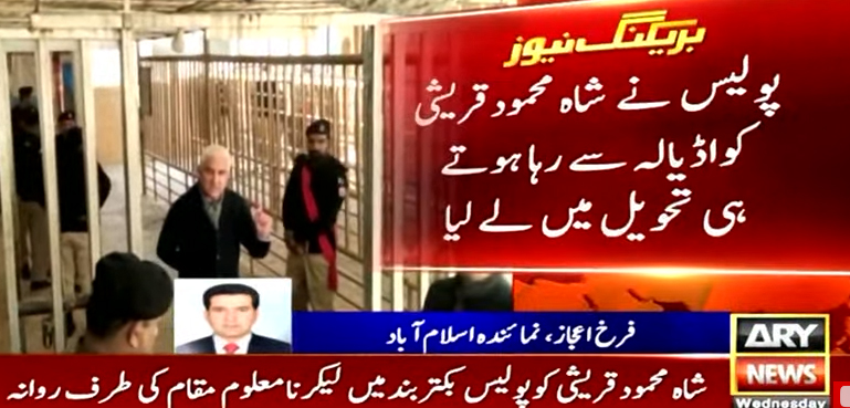 اے آر وائی نیوز کے مطابق پی ٹی آئی کے سینیئر وائس چیئرمین شاہ محمود قریشی کو اڈیالہ جیل سے رہا کر دیا گیا تاہم جیل سے نکلتے ہی تھانہ آر اے بازار پولیس نے انہیں دوبارہ گرفتار کرلیا ہے اور انہیں بکتر بند میں لے کر نامعلوم مقام کی طرف روانہ ہو گئی ہے۔