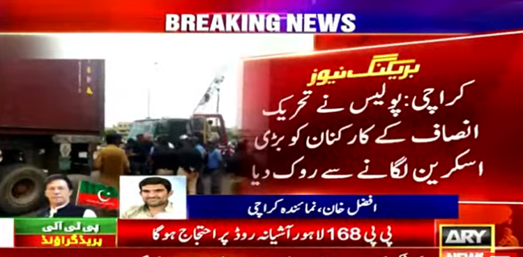 کراچی : پولیس نے تحریک انصاف کے کارکنان کو سی ویو پر عمران خان کا خطاب براہ راست دکھانے کیلئے بڑی اسکرین لگانے سے روک دیا۔