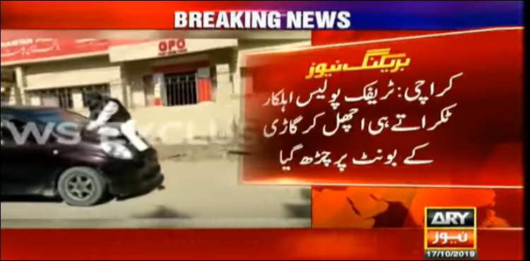 تفصیلات کے مطابق کراچی کے علاقے نیپا چورنگی پوسٹ آفس کے قریب ٹریفک پولیس اہلکار نے کار سوار کو رکنے کا اشارہ کیا تو کار سوار نے فرار ہونے کی کوشش کی جس پر اہلکار گاڑی کے بونٹ پر چڑھ کر بیٹھ گیا۔