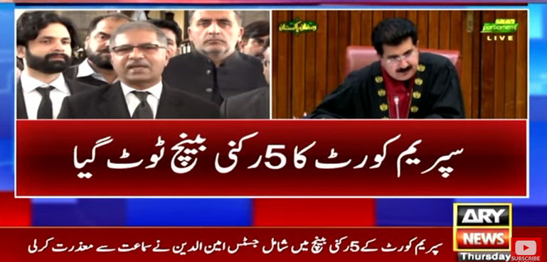 اے آر وائی نیوز کے مطابق پنجاب اور خیبر پختونخواہ صوبوں میں انتخابات کی تاریخ ملتوی کرنے کے خلاف درخواست پر سماعت کرنیوالے پانچ رکنی بینچ میں شامل جسٹس امین الدین نے مزید سماعت سے معذرت کر لی ہے جس کےبعد یہ بینچ ٹوٹ گیا ہے۔