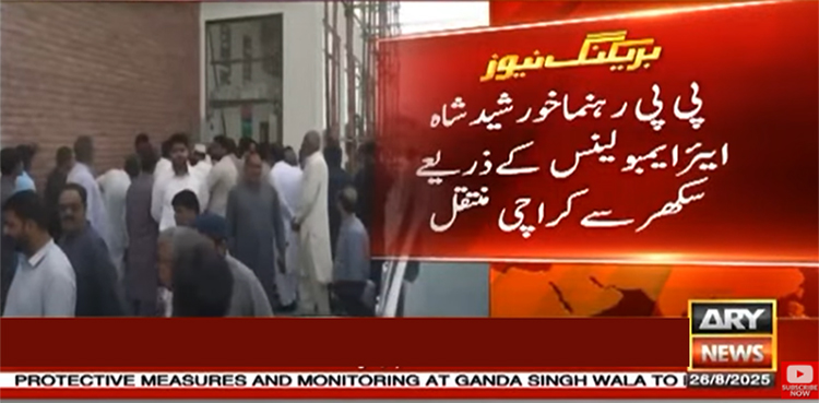 پیپلزپارٹی کے سینئر رہنما سید خورشید کو شاہ ایئر ایمبولینس کے ذریعے سکھر سے کراچی منتقل کر دیا گیا۔