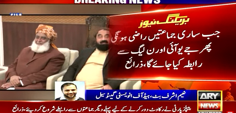 تاہم اس حوالے سے ذرائع کا کہنا ہے کہ پی ڈی ایم کے سربراہ فضل الرحمٰن اپوزیشن سے مذاکرات میں رکاوٹ ہیں جس پر پیپلز پارٹی نے یہ رکاوٹ دور کرنے کے لیے پہلے دیگر سیاسی جماعتوں سے رابطے شروع کر دیے ہیں۔