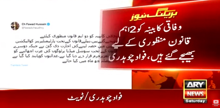 سماجی رابطے کی ویب سائٹ ٹوئٹر پر وفاقی وزیر اطلاعات و نشریات فواد چوہدری نے کہا کہ وفاقی کابینہ کو دو اہم قانون منظوری کے لیے بھیجے گئے ہیں، پہلے قانون میں پارلیمنٹیرینز کو الیکشن مہم میں شرکت کی اجازت دی گئی ہے۔