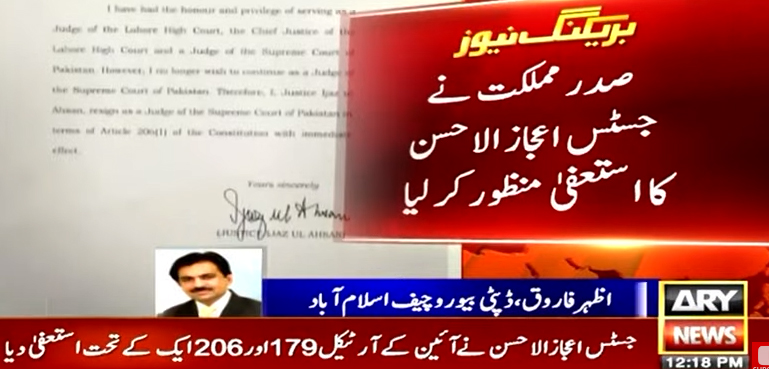 جسٹس اعجازالاحسن نے دو روز پہلے جسٹس مظاہر نقوی کیخلاف کارروائی سے اختلاف کیا تھا اور گزشتہ روز انہوں نے آئین کے آرٹیکل 179 اور 206 ایک کے تحت استعفیٰ دیتے ہوئے اپنا استعفیٰ صدر مملکت کو بھجوایا تھا۔