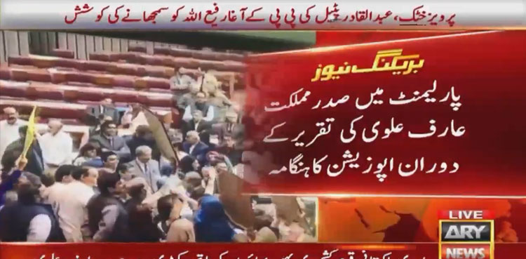 صدر مملکت کے خطاب کے دوران اپوزیشن ارکان نے اسپیکر کے ڈائس کا گھیراؤ کر لیا اور تقریر اور ایجنڈے کی کاپیاں ہوا میں اڑا دیں۔