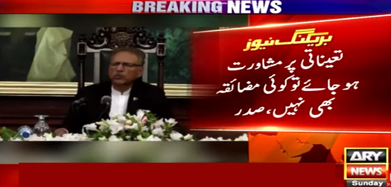 صدر عارف علوی نے کہا ہے کہ آئین آرمی چیف کی تعیناتی کے لیے مشاورت کی اجازت نہیں دیتا تاہم مشاورت ہوجائے تو کوئی مضائقہ بھی نہیں۔