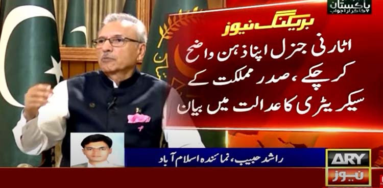 عارف علوی کے سیکریٹری نے عدالت میں بیان دیتے ہوئے کہا کہ صدر مملکت اٹارنی جنرل کے بجائے سلمان اکرم راجہ کو صدر کی جانب سے دلائل دینے کی اجازت دی جائے۔