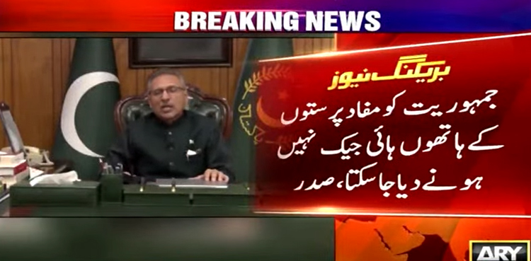 سماجی رابطے کی ویب سائٹ ٹوئٹر پر اپنے بیان میں صدر مملکت عارف علوی نے کہا کہ ہم ایک امتحان سے گزر رہے ہیں، جمہوریت کو مفاد پرستوں کے ہاتھوں ہائی جیک نہیں ہونے دیا جاسکتا۔