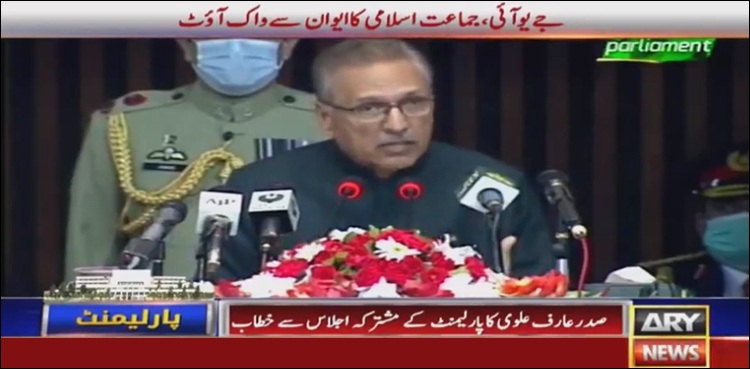 اے آر وائی نیوز کی رپورٹ کے مطابق صدرمملکت عارف علوی نے پارلیمنٹ کے مشترکہ اجلاس سے خطاب کرتے ہوئے کہا کہ وزیراعظم عمران خان نےکشمیرپراقوام متحدہ میں تقریرکی،عالمی سطح پرکشمیرکازکوبھرپوراندازمیں اٹھایاگیا، 5 اگست کے بھارتی غیرقانونی اقدامات کی مذمت کرتے ہیں۔ انشااللہ جلدکشمیرآزادہوگا اورہندوتواکانظریہ مزیدنہیں چلےگا۔