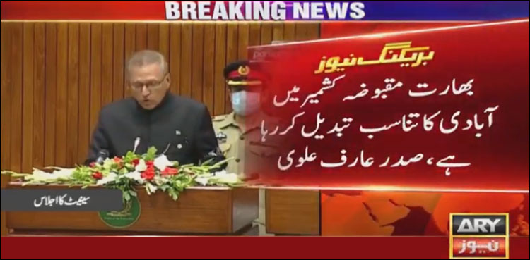 اے آر وائی نیوز کی رپورٹ کے مطابق صدر مملکت عارف علوی نے سینیٹ میں اظہار خیال کرتے ہوئے کہا کہ کشمیریوں پر ظلم کے خلاف آواز اٹھانے والوں کے مشکور ہیں، مقبوضہ کشمیرسےمتعلق عالمی رپورٹس جاری کرنےوالوں کامشکورہوں، ایسی رپورٹس دنیاکوبتارہی ہیں مقبوضہ کشمیرمیں کیسےظلم کیاجارہاہے۔