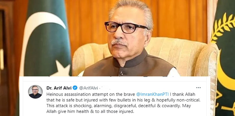 صدر علوی نے کہا کہ عمران خان کے قاتلانہ حملے میں بچ جانے پر اللہ تعالیٰ کا شکر ادا کرتا ہوں، یہ حملہ افسوسناک، تشویشناک، مکرو فریب سے پُر اوربزدلانہ ہے۔