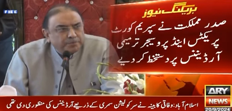 اے آر وائی نیوز کے مطابق صدر مملکت آصف زرداری نے سپریم کورٹ پریکٹس اینڈ پروسیجر ترمیمی آرڈیننس 2024 پر دستخط کر دیے ہیں جس کے بعد اب یہ قانون بن گیا ہے۔ اس سے قبل وفاقی کابینہ نے سرکولیشن سمری کے ذریعے آرڈیننس کی منظوری دی تھی۔