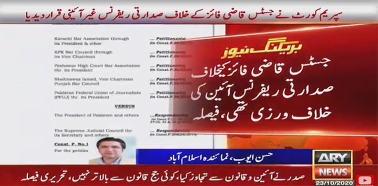فیصلے میں واضح کیا گیا ہے کہ صدر نےآئین وقانون سےتجاوزکیا،کوئی جج قانون سےبالاترنہیں، شہزاداکبر کےایسٹ ریکوری یونٹ کی کوئی قانونی حیثیت نہیں ہے، جسٹس قاضی فائزعیسیٰ کیخلاف جمع کرایا جانے والاتمام مواد غیرقانونی قرار ہے۔