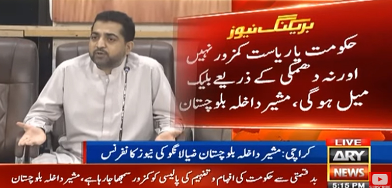 مشیر داخلہ بلوچستان ضیا اللہ لانگو نے کہا ہے کہ حکومت یا ریاست کمزور نہیں اور نہ دھمکی کے ذریعے بلیک میل ہوگی۔