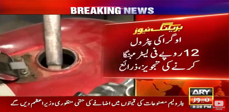 ذرائع کے مطابق اوگرا نے پٹرول 12روپے فی لیٹر مہنگا کرنے کی تجویز دی ہے جب کہ ڈیزل کی قیمت میں 10 روپے فی لیٹر اضافے کی تجویز ہے۔