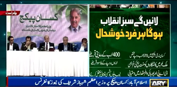 شہباز شریف نے بتایا کہ کسانوں کی مشکلات کم کرنے کے لئے ‘کسان پیکج’ کے تحت 1800 ارب روپے کے قرضہ جات دینے کا اعلان کیا ہے جوکہ اس سے قبل 1400 ارب روپے تھا جبکہ کسانوں کے قرضوں پر مارک اپ ادا کرنے کیلئے10ارب روپے مختص کررہےہیں