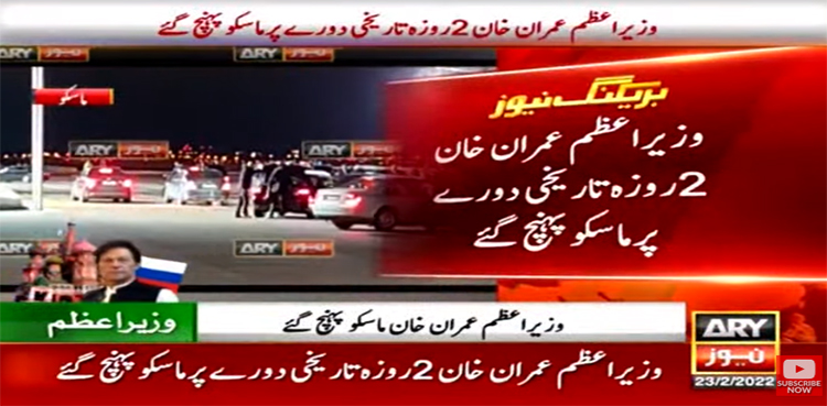 وزیراعظم عمران خان دو روزہ دورے پر ماسکو پہنچے تو ایئرپورٹ پر مہمانوں کو پرُتپاک استقبال کیا گیا، وزیراعظم کو چاق و چوبند دستے نے گارڈآف آنر پیش کیا۔ وزیراعظم عمران خان سیکیورٹی پروٹوکول کیساتھ ہوٹل روانہ ہوئے ایئرپورٹ سےہوٹل تک کےراستے کو برقی قمقموں سےسجایا گیا ہے۔
