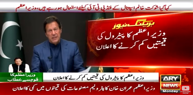 قوم سے خطاب میں وزیراعظم عمران خان نے عالمی سطح پر مہنگائی کے باوجود عوام کو ریلیف دیتے ہوئے یٹرولیم مصنوعات اور بجلی کی قیمتوں میں کمی کا اعلان کیا ہے انہوں نے کہا کہ روس اوریوکرین جنگ کی وجہ سےخوف ہےتیل کی قیمتیں بڑھیں گی دنیا کی30فیصدگیس روس یوکرین سےآتی ہےقیمت بڑھےگی پاکستان میں آج بھی پیٹرول اور ڈیزل کی قیمتیں کم ہیں اپوزیشن تنقیدکرتی ہےان کےپاس کیاحل ہے اگر اپوزیشن کےپاس تیل کی قیمتوں کے پاس کوئی تجویز ہےتو بتائے پاکستان میں سبسڈی نہ دیں توفی لیٹرقیمت220روپےہو، حکومت نے فیصلہ کیا ہے کہ مہنگائی میں اضافے کے خدشے کے باوجود قیمتیں بڑھانے کی بجائے کم کی جائیں گی۔