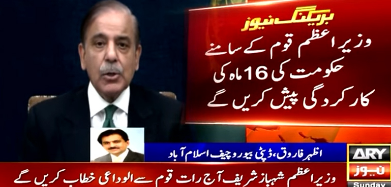 وزیراعظم شہباز شریف آج شب قوم سے الوداعی خطاب کریں گے جس میں وہ حکومت کی 16 ماہ کی کارکردگی پیش کریں گے۔