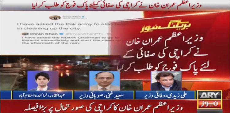 دوسری جانب وزیر تعلیم سندھ سعید غنی نے پروگرام الیونتھ آور میں گفتگو کرتے ہوئے کہا کہ سمجھ نہیں آرہی وزیراعظم نے پاک فوج کو مدد کے لیے کہا ہے، نالوں کی صفائی ڈی ایم سی اور کے ایم سی کی ہوتی ہے،
