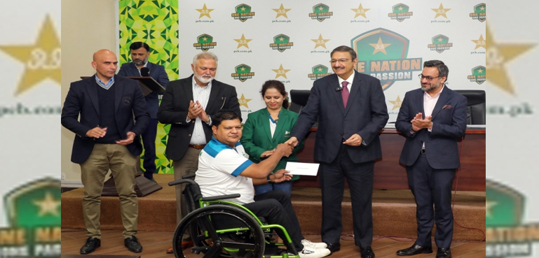 ایشیا کپ جیت کر سبز ہلالی پرچم بلند کرنے والی پاکستان وہیل چیئر کرکٹ ٹیم پر انعامات کی برسات ہوگئی پی سی بی نے 36 لاکھ نقد انعامی رقم کا چیک دے دیا۔