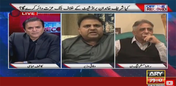 پروگرام میں گفتگو کرتے ہوئے وفاقی وزیر فواد چوہدری کا کہنا تھا کہ براڈشیٹ معاہدہ نہ ہم نےکیانہ ہم نےختم کیاہے، ن لیگ توکہتی ہےبڑی فہرست ہےجن پرکیسزکرنےہیں، آپ لوگوں نےتوزرداری سےپیسےنکالنےتھےساتھ جاکربیٹھ گئے۔