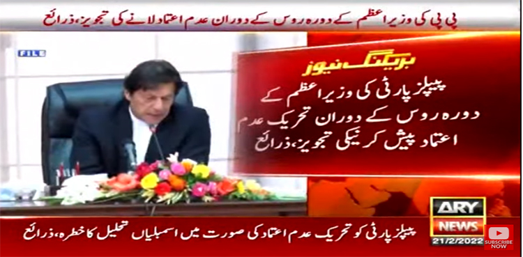 ہیڈ آف انویسٹی گیٹو سیل اے آر وائی نیوز نے اپنے ذرائع کے حوالے بتایا ہے کہ اپوزیشن کی جانب سے حکومت کے خلاف عدم اعتماد لانے کے لیے پیپلزپارٹی نے وزیراعظم کے دورہ روس کا وقت تجویز کیا ہے۔