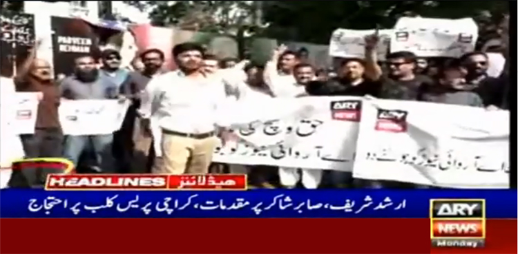 کراچی کے صحافیوں نے اے آر وائی کے حق میں فیصلہ دے دیا۔ اے آروائی نیوز پر قدغنوں اور سینیر صحافی ارشد شریف اور صابر شاکرکے خلاف مقدمات اور حکومتی دباؤ کے خلاف کراچی پریس کلب کے باہر صحافتی تنظیموں نے احتجاج کیا۔