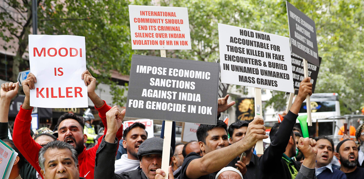 غیر ملکی خبررساں ادارے کے مطابق لندن میں کشمیری اور پاکستانی کمیونٹی نے بھارتی جاحیت کے خلاف آواز بلند کی اور مظلوم کشمیریوں کی آزادی کے لیے نعرے بازی کی۔
