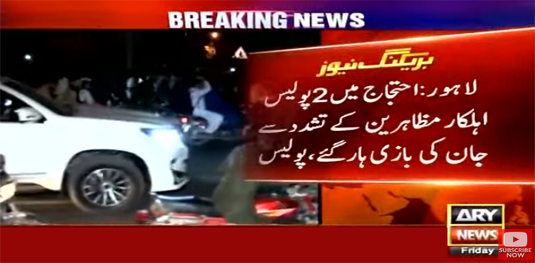 مظاہرین نے ڈیوٹی پر مامور اہلکاروں کو گاڑی تلے روند ڈالا جس کے نتیجے میں 5 اہلکار زخمی ہوئے جن میں 2 کانسٹیبل زخموں کی تاب نہ لاتے ہوئے اسپتال میں دم توڑ گئے۔