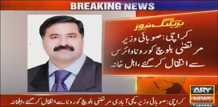 اے آر وائی نیوز کی رپورٹ کے مطابق صوبائی وزیر کچی آبادی مرتضیٰ بلوچ کرونا وائرس سے انتقال کرگئے، وہ کئی دنوں سے کراچی کے مقامی اسپتال میں زیر علاج تھے۔
