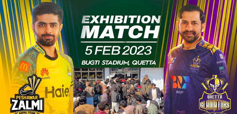 پی ایس ایل کا نمائشی میچ اتوار 5 فروری کو کوئٹہ کے بگٹی اسٹیڈیم میں کھیلا جائیگا جس میں پاکستان کے میگا اسٹارز ایکشن میں نظر آئیں گے۔