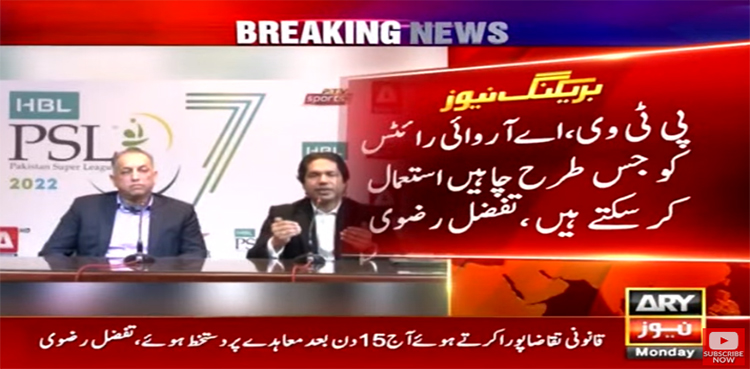 تفضل رضوی نے کہا کہ پی ایس ایل رائٹس کےطریقہ کار کیخلاف ہائیکورٹ میں پٹیشن فائل ہوئی لاہورہائیکورٹ نے دیکھا کچھ غیرقانونی نہ تھاتو پٹیشن خارج کردی ایسی کوئی بھی قانونی قدغن نہیں تھی جو آج معاہدہ نہ کیا جاسکتا۔