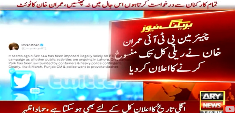 اے آر وائی نیوز کے مطابق پاکستان تحریک انصاف کی ریلی روکنے کے لیے پنجاب حکومت کی جانب سے دفعہ 144 کے نفاذ اور راستے بند کیے جانے کے بعد کسی بھی ناخوشگوار صورتحال سے بچنے کے لیے آج اعلان کردہ ریلی کل تک منسوخ کرنے کا اعلان کیا ہے۔