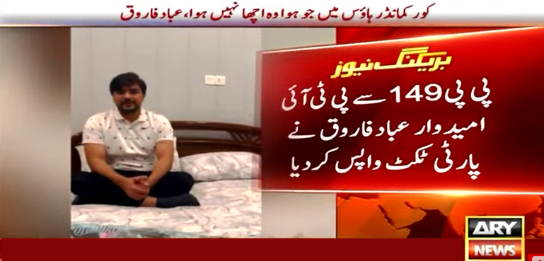 پنجاب اسمبلی کے لاہور سے حلقہ 149 سے پاکستان تحریک انصاف کے امیدوار عباد فاروق نے پارٹی کا ٹکٹ واپس کر دیا ہے۔
