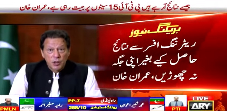 سابق وزیراعظم عمران خان نے سماجی رابطے کی ویب سائٹ ٹوئٹر پر اپنے بیان میں کہا کہ جو نتائج آرہے ہیں اس کے مطابق پی ٹی آئی کم از کم 15 سیٹوں پر جیت رہی ہے، پولنگ اسٹیشنز پر تعینات پی ٹی آئی کے جوان چوکس رہیں۔