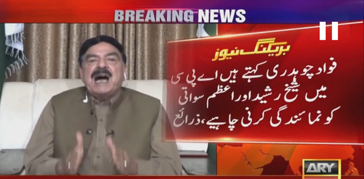 ذرائع نے بتایا کہ فواد چوہدری نے عمران خان کو مشورہ دیا ہے کہ اے پی سی میں شیخ رشید اور اعظم سواتی کو نمائندگی کرنی چاہیے، شیخ رشید سابق وزیرداخلہ رہ چکے ہیں، سیکیورٹی صورتحال سے واقف ہیں۔