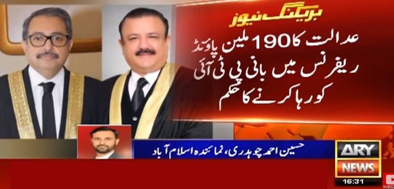 اے آر وائی نیوز کے مطابق اسلام آباد ہائیکورٹ نے 190 ملین پاؤنڈز ریفرنس کا محفوظ فیصلہ سناتے ہوئے بانی پی ٹی آئی کی ضمانت منظور کر لی ہے اور انہیں رہا کرنے کا حکم دیا ہے۔
